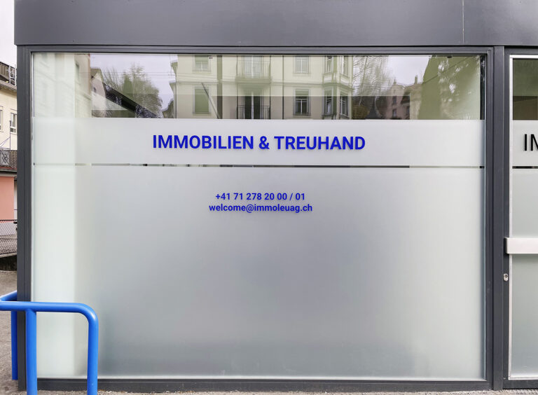Die Beschriftung Ihrer Eingangstüre ist ein wichtiger Imageträger Ihrer Firma. Ob zu Informationszwecken, für Produktinformationen, Ankündigungen, als Sichtschutz oder einfach um Ihre Firma nach aussen zu repräsentieren. Unabhängig davon, ob Sie dauerhafte Informationen wie z.B. Öffnungszeiten oder eine kurzfristige Aktion kommunizieren möchten; für jedes Bedürfnis haben wir die passende Lösung.